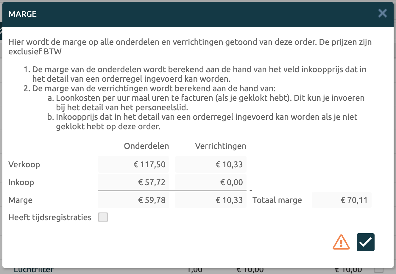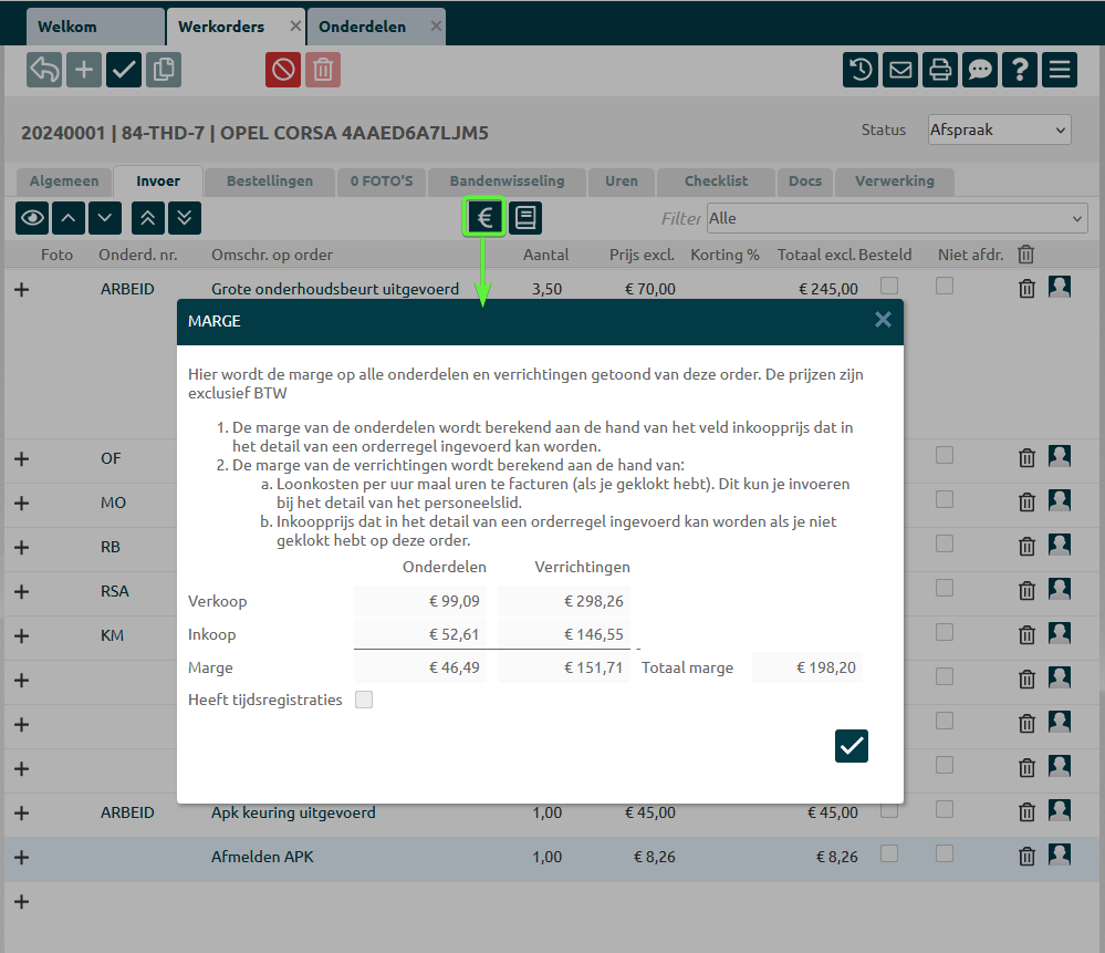 De knop toont een pop-up waarbij over de onderdelen en verrichtingen de marge wordt berekend tussen inkoop en verkoop. Hierdoor zie je wat je op de order verdient als winstmarge.