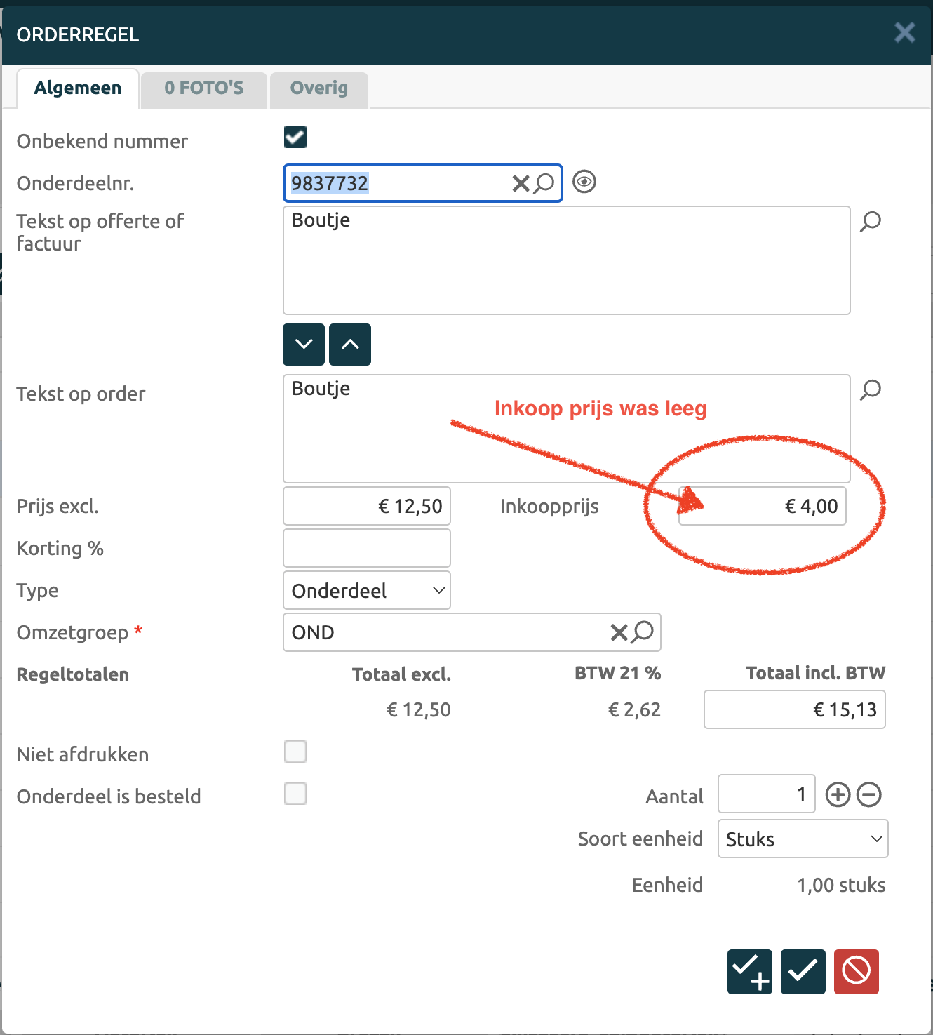 Zodra je het onderdeel opzoekt, de inkoopprijs opvoert, terugkeert naar de werkorder en klikt op de margeknop, dan zul je zien dat de ‘problemen’ voor dit onderdeel zijn opgelost.