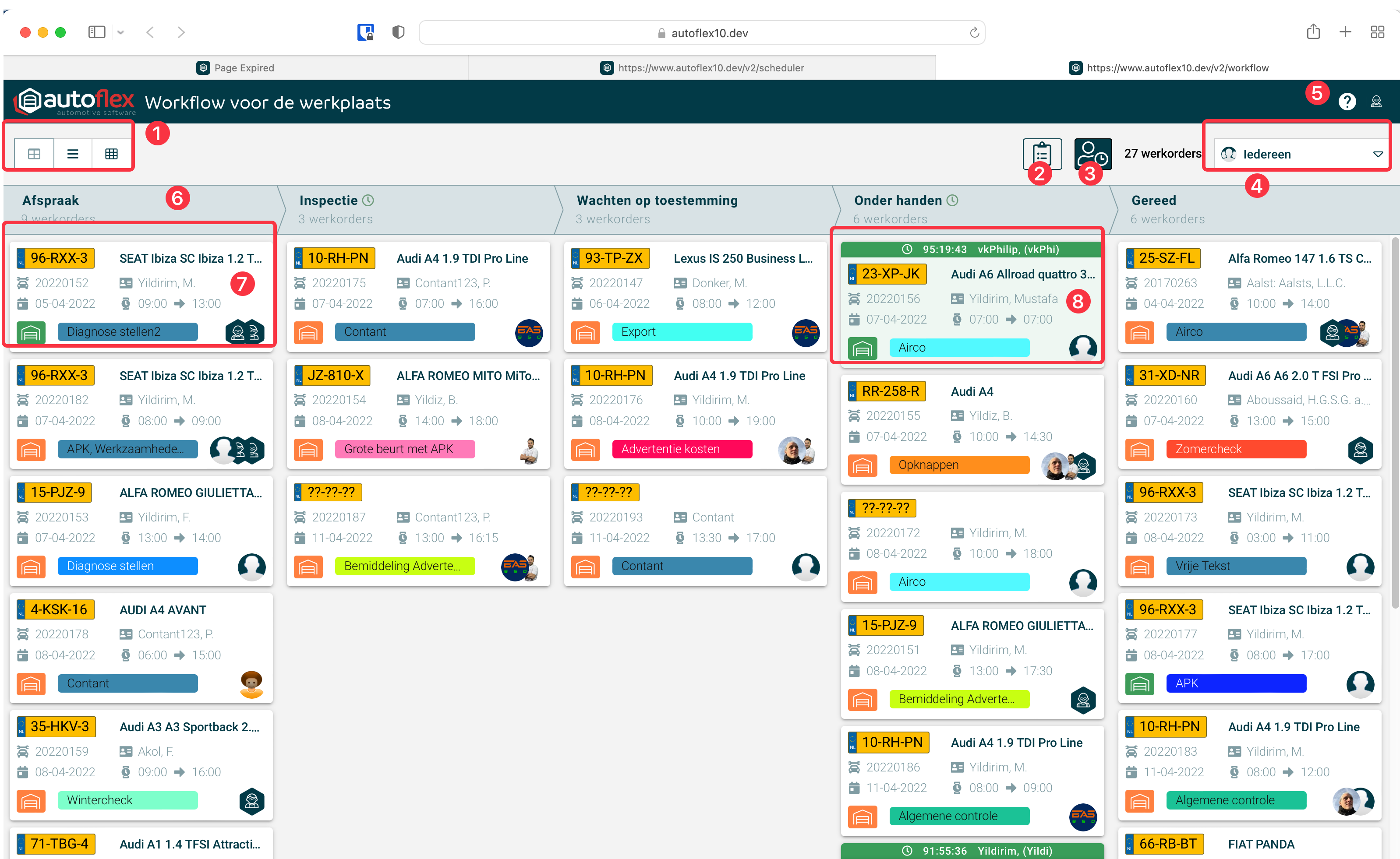Het workflow scherm geeft in één oogopslag inzicht in de voortgang van de voertuigen binnen de werkplaats. Het scherm is ingedeeld in 5 verschillende statussen, binnen elke status wordt de werkorder getoond als een kaartje met daarop de meest belangrijke informatie.